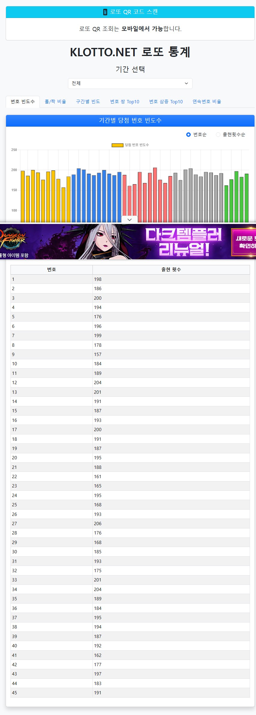 로또 통계 그래프 페이지 개선 및 데이터 보정운영자2026년 01월 24일공지사항 안녕하세요. klotto운영자입니다. 로또 통계 그래프 페이지 개선하였습니다. 기존 각 항목별 그래프만 표시되던 부분을 각 항목별 탭으로 구분하고 그래프 하단에 테이터데이블을 표시하여 좀 더 확실하게 확인 할 수 있도록 개선하였습니다. 그리고 로또 데이터에 일부 오류가 있어서 수정하였습니다. 감사합니다.