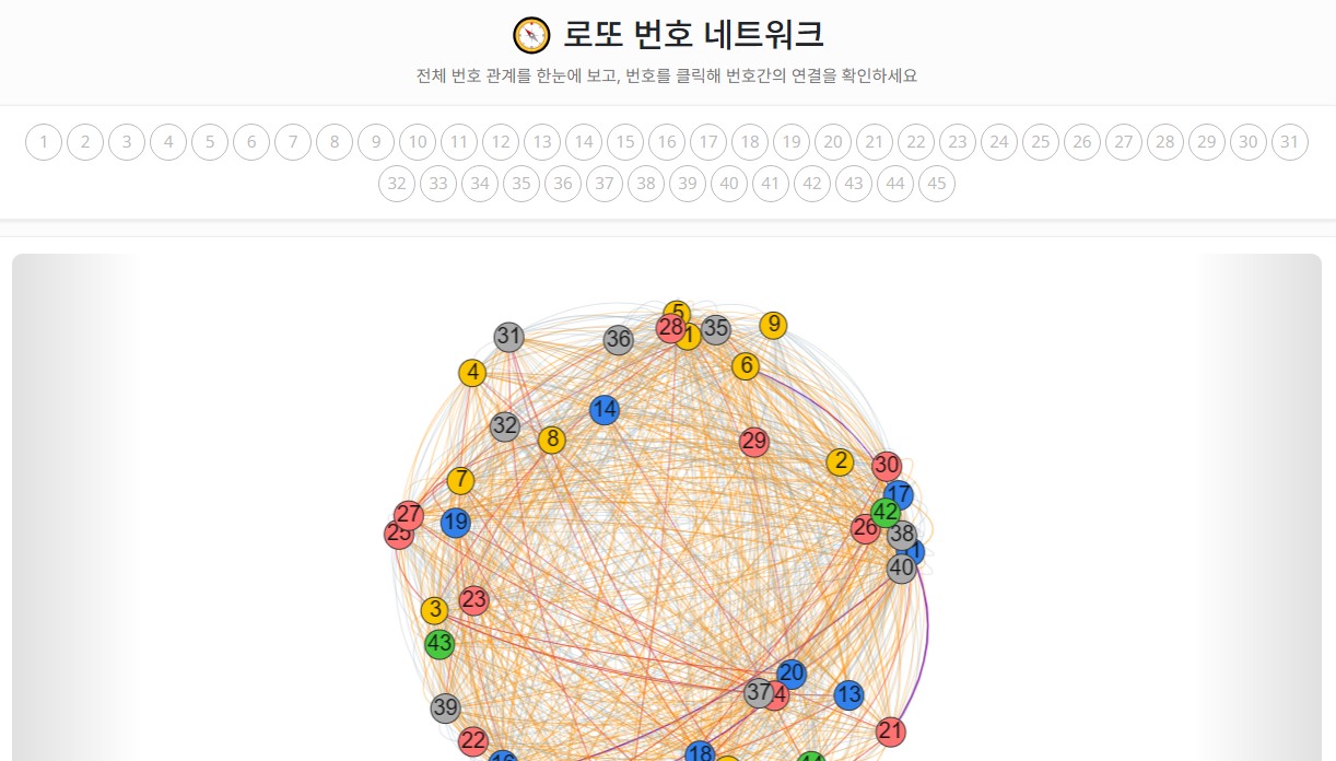 로또 번호 네트워크(관계네트워크)기능 추가 안내운영자2026년 01월 15일공지사항 안녕하세요. KLOTTO.NET 운영자입니다. 최근 관계네트워크라는 메뉴를 추가하였습니다. 해당 페이지에서는 각 로또 번호들의 관계를 한눈에 볼 수 있는 페이지로써 각 번호가 얼마나 강력하게 연결되어 있는지를 연결선으로 보여주고 선택한 번호에 따라 가장 강력한 관계의 번호 > 중간관계 > 약한 관계 순으로 확인이 가능하며 선택번호와 강력한 연결관계를 가지는 번호를 토대로 랜덤으로 번호 생성이 가능합니다. 로또 관계네트워크