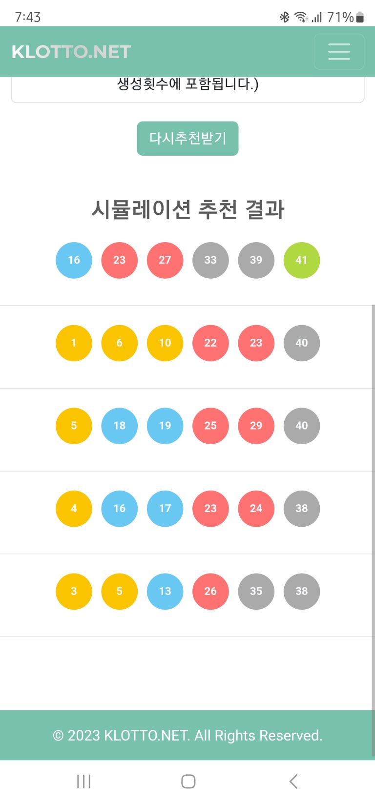1063회차 로또를 klotto.net 에서 제공하는 시뮬레이션 번호 추천을 통해 생성된 번호를 가지고 구매해 보았습니다. 결과는 2023년 4월 15일에 확인해 보겠습니다……. 아 참고로 지난주에는 시뮬레이션 추천 말고 그냥 랜덤 생성으로 5등 당첨이 되긴했습니다….만… 본전이네요..ㅋ